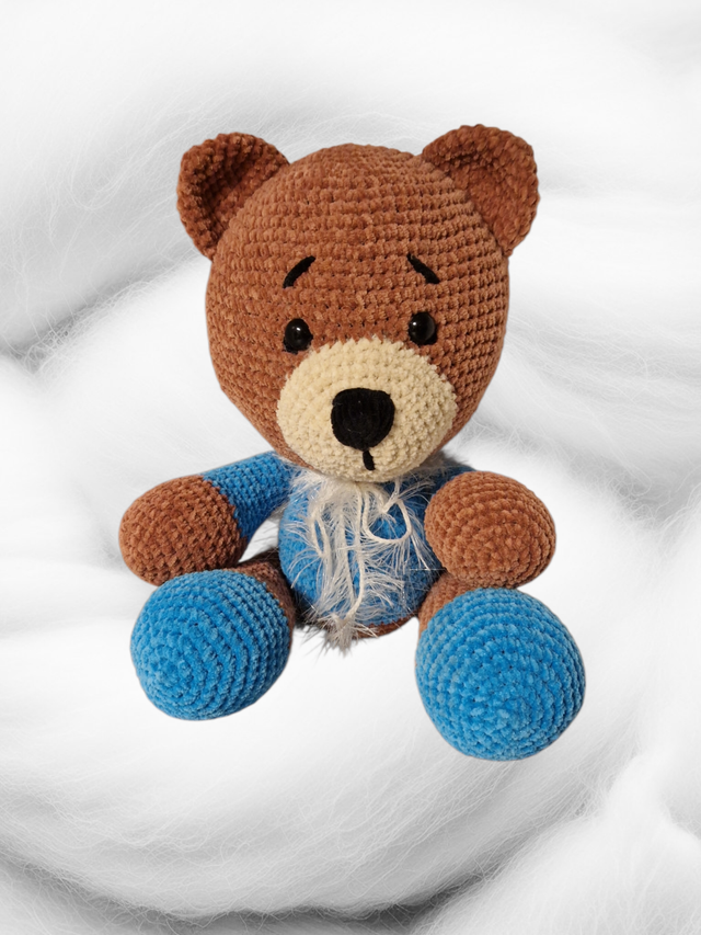 BEN est un ours réalisé au crochet avec une laine chenille 100% polyester.